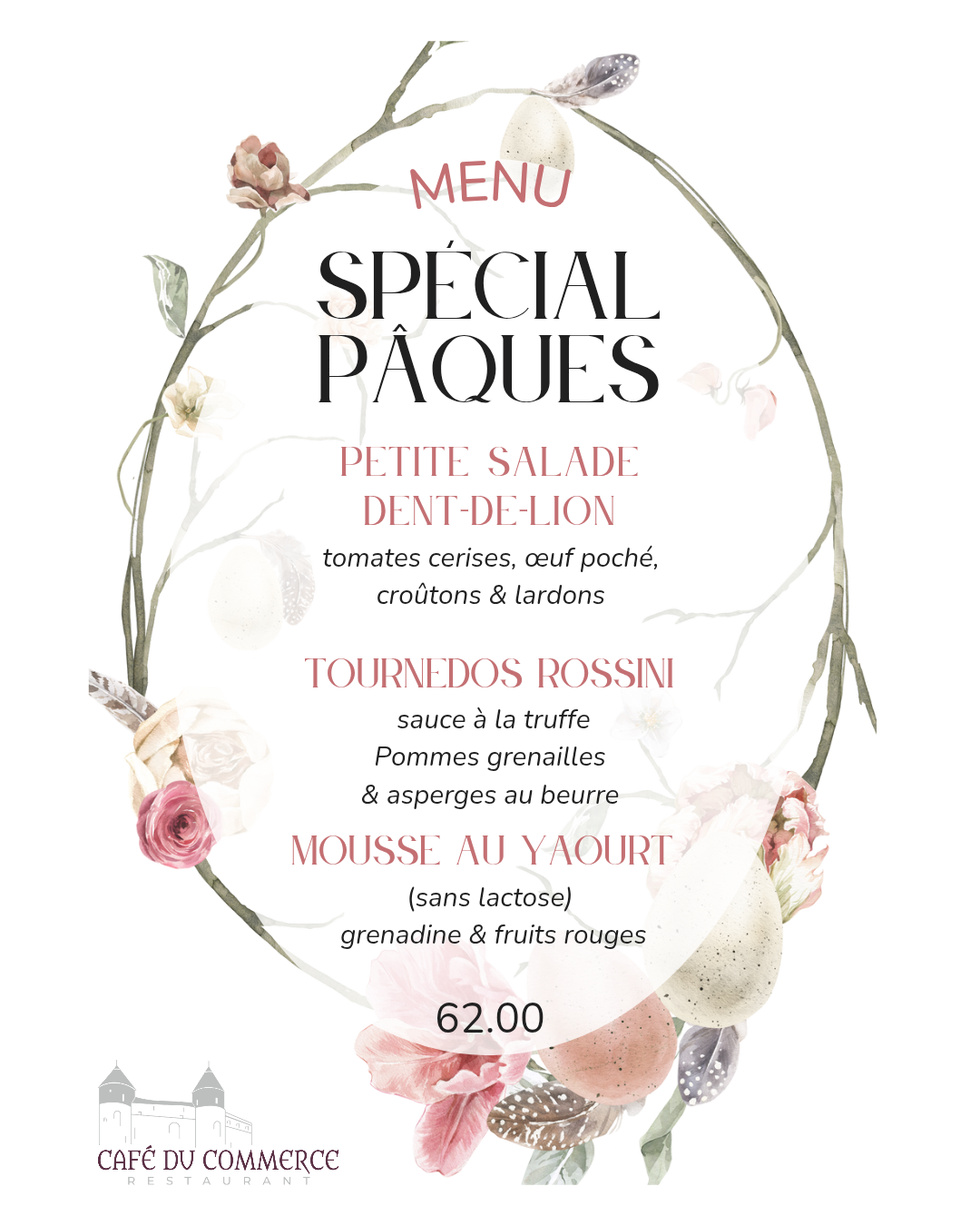 Excellentes fêtes de Pâque ! menu de pâques Menu valable dimanche 05.04.Carte habituelle disponible également Réserver votre table Réservations en ligne Au plaisir de vous régaler ! Réserver votre table